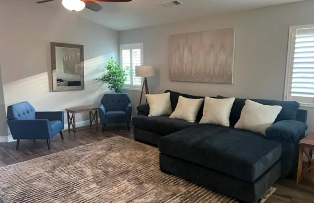 Diese Villa in Bakersfield bietet aus den Fenstern einen Blick auf den Garten.
